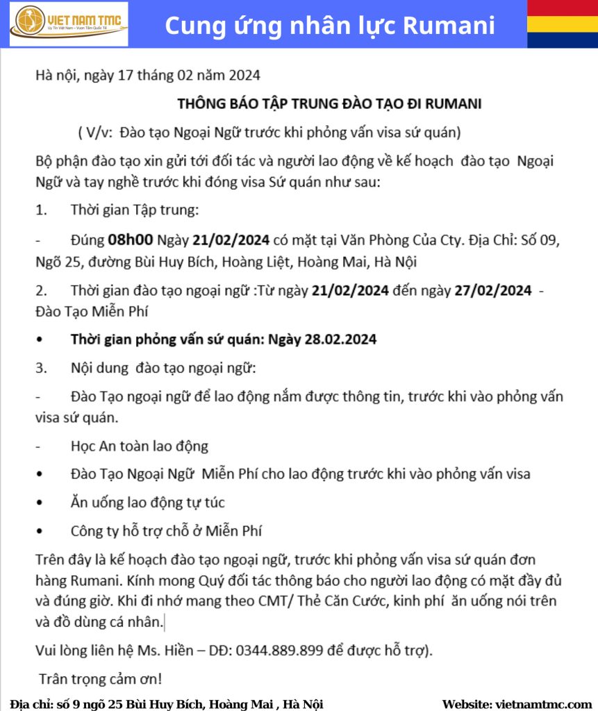 LỊCH PHỎNG VẤN, TIN TỨC Lịch phỏng vấn đại sứ quán Rumani 21/2/2024 13 Th5 Lịch phỏng vấn đại sứ quán Rumani 21/2/2024