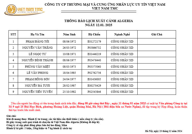 9 lao động Xuất Cảnh Sang Algeria ngày 13/01/2025