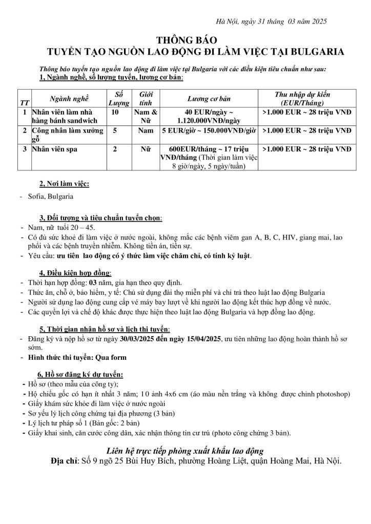 Để biết thêm chi tiết và đăng ký tham gia chương trình xuất khẩu lao động Bulgaria, vui lòng liên hệ trực tiếp tại địa chỉ: